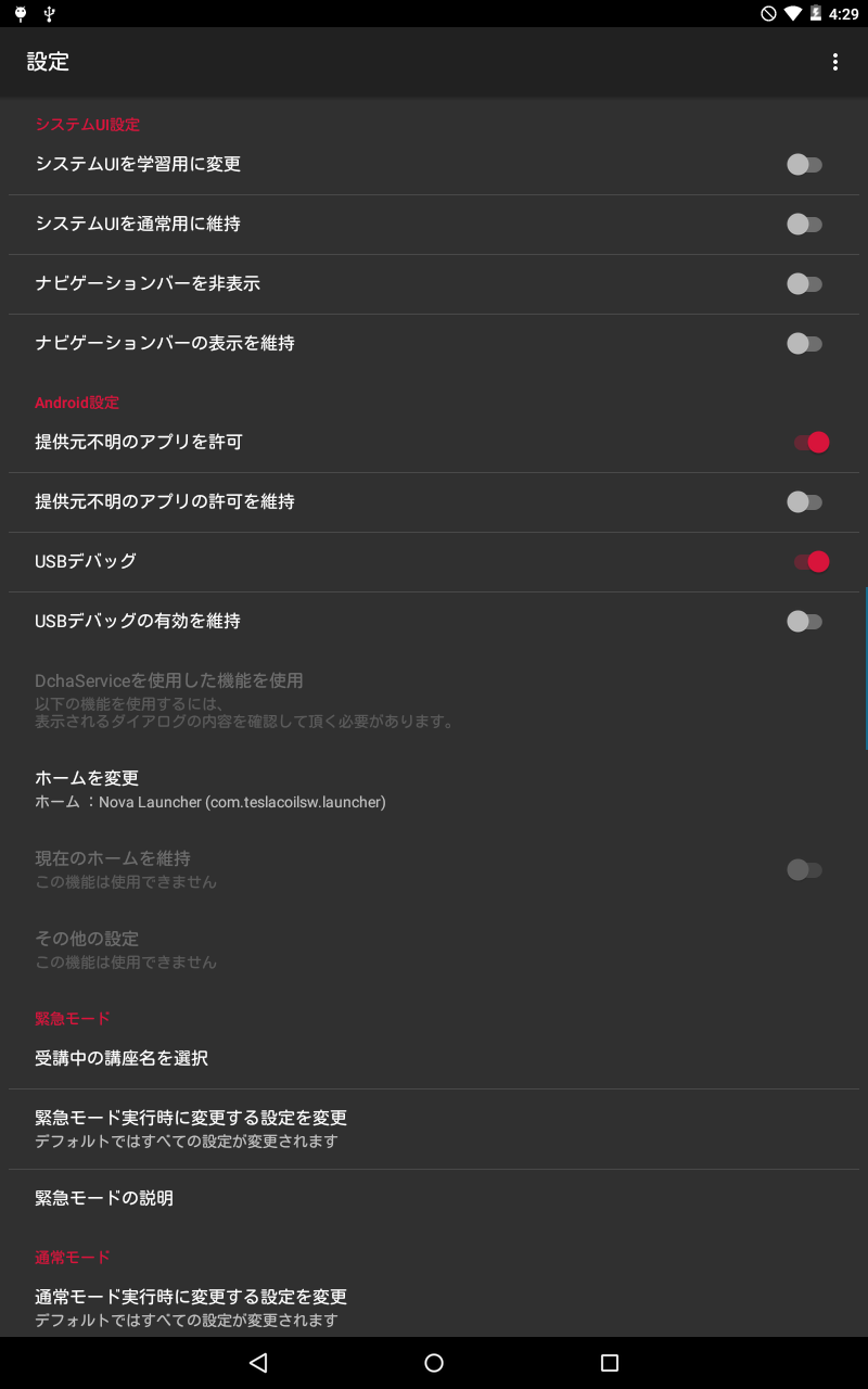 - チャレンジパッド3の方は提供元不明のアプリを許可の設定、USBデバッグの設定を使用するには、ADBで"android.permission.WRITE_SECURE_SETTINGS"を付与する必要がありますので注意してください。付与せずにスイッチを変更するとアプリがクラッシュします。