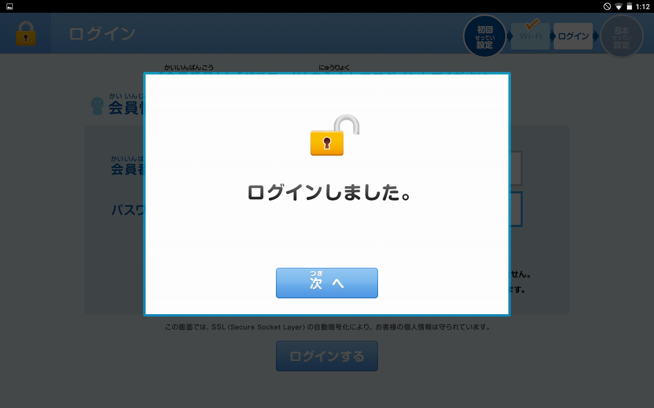 入力が完了し、ログインを押すと『ログインしました。』と表示されます。