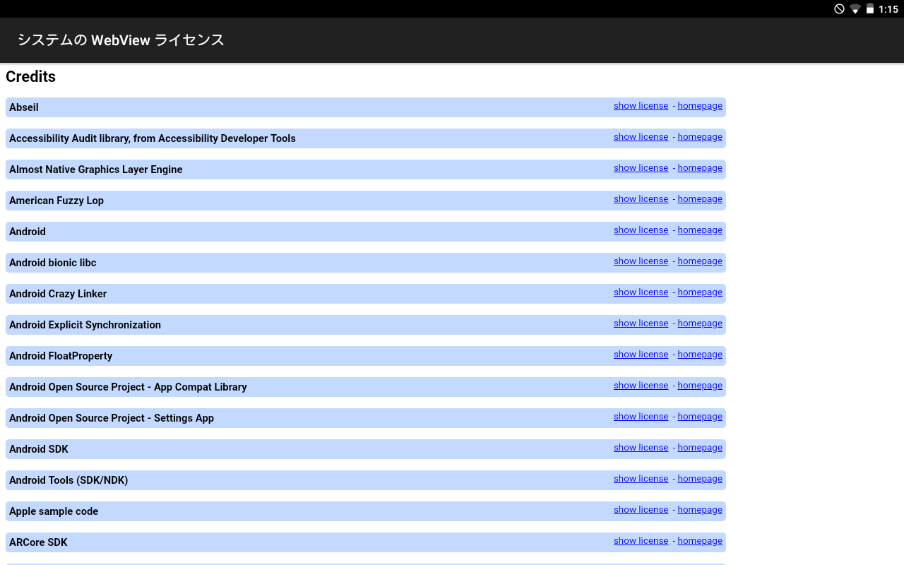 設定→タブレット情報→法的情報→システムのWebViewライセンス→homepageと書かれた文字を押す。